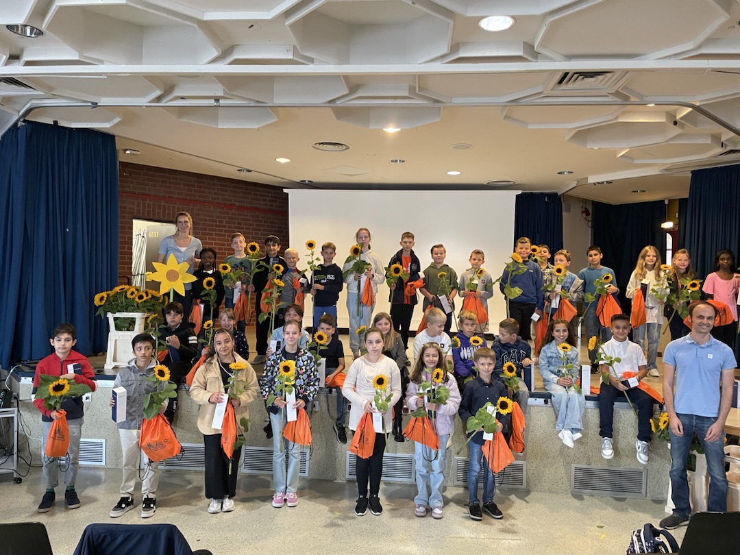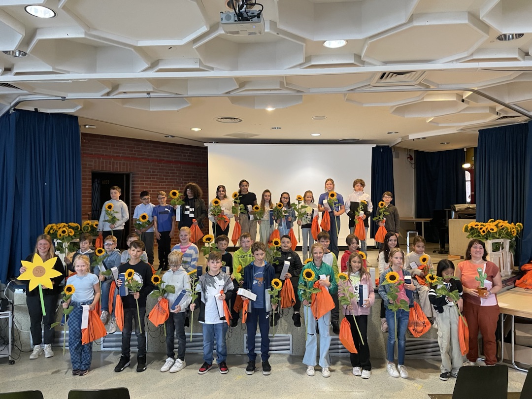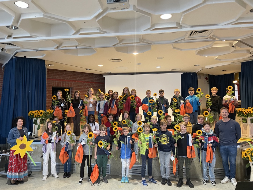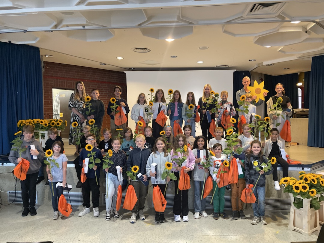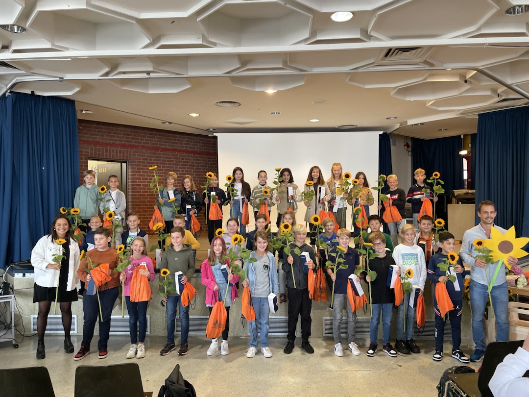 Anfangs freudig-nervöse Blicke der Neuankömmlinge hellten sich immer weiter auf. Als es nach weiteren begrüßenden Worten des Erprobungsstufenteams, Stefan Radau und Victoria Schoeneberg, in Richtung der Begrüßungsgeschenke, einer Sonnenblume, einem Turnbeutel, gefüllt mit nützlichen Dingen für den Schulalltag und einer Thermotrinkflasche mit Namen der Schüler*innen, ging, und zum ersten gemeinsamen Klassenfoto, wich die anfängliche Nervosität der Fünftklässler*innen und ihrer Familien vielen strahlenden Gesichtern.