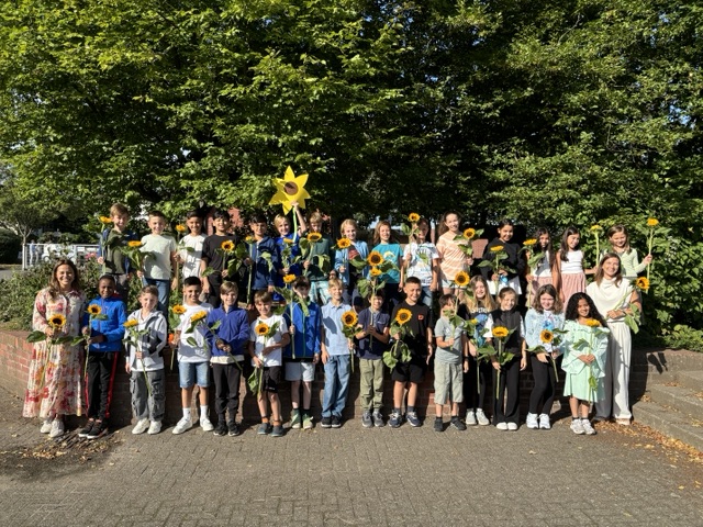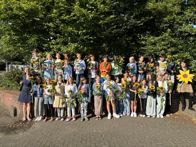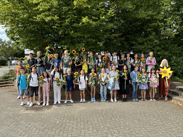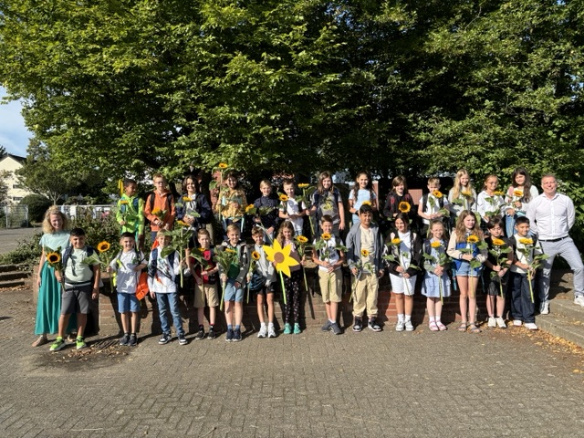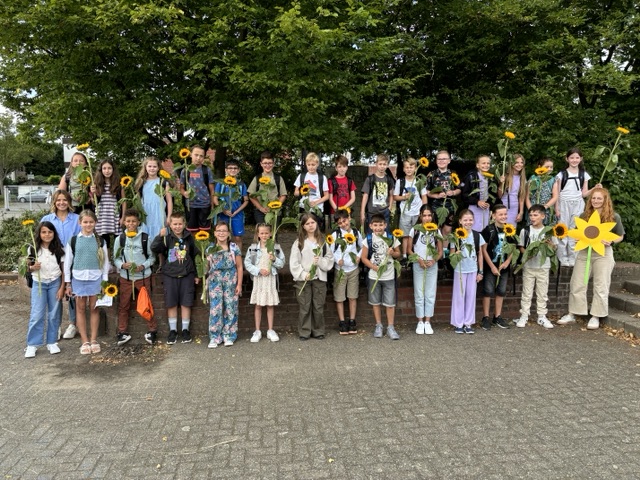 Freundliche begrüßende Worte richteten zudem Frau Schmitter als Schulsozialarbeiterin, Frau Grams als Schulsonderpädagogin und Frau Guardiera als Vorsitzende der Schulpflegschaft an die anwesenden Familien. Spätestens als es nach weiteren begrüßenden Worten des Erprobungsstufenleiters, Stefan Radau, in Richtung der Begrüßungsgeschenke, einer Sonnenblume, einem Turnbeutel und einer Thermostrinkflasche mit Namen der Schüler:innen ging, und zum ersten gemeinsamen Klassenfoto, wich die anfängliche freudige Nervosität der Fünftklässlerinnen und Fünftklässler und ihrer Familien vielen strahlenden Gesichtern.