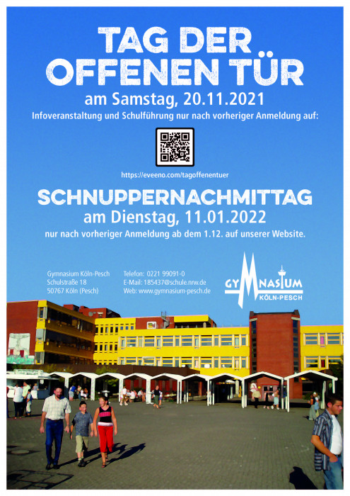 Ab Januar ist auf unserer Schulwebsite die Online-Anmeldung für den Schnuppernachmittag am 11.01.2022 und den Elterninformationsabend am 18.01.2022 möglich. Am Schnuppernachmittag können die Schüler*innen der Grundschulklassen 4 erste Unterrichtserfahrungen am Gymnasium Köln-Pesch sammeln und am Elterninformationsabend geht es neben allgemeinen Informationen im Schwerpunkt um die Präsentationen der Eingangsprofile Kulturklasse und Forscherklasse. Auch hier beobachten wir das Infektionsgeschehen und werden ggf. unser Vorgehen anpassen.