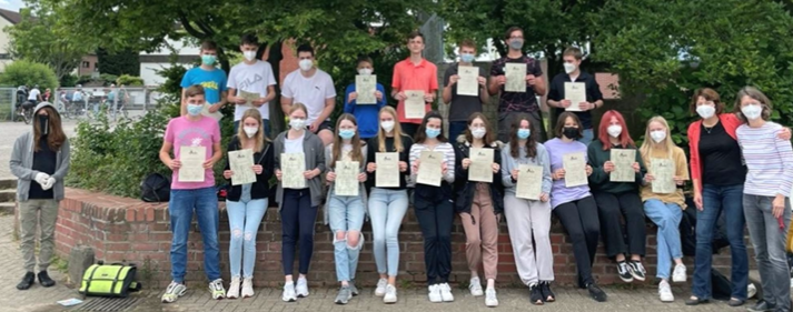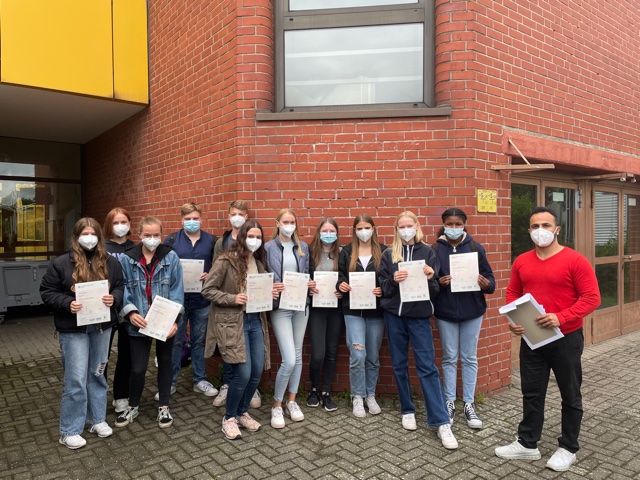 Die Teilnehmerinnen der Cambridge-AG am Gymnasium Köln-Pesch können endlich ihre Zertifikate mit großem Stolz präsentieren. Insgesamt haben sich 12 Schülerinnen im vergangenen Schuljahr (2020/2021) der Herausforderung First Certificate English for Schools (Niveaustufe B2) gestellt und das mit großem Erfolg. Viele der Teilnehmer*innen haben sogar das Niveau C1 erreichen können. Die Cambridge-AG, die im vergangenen Schuljahr unter der Leitung von Behzad Pourharandi angeboten wurde, diente der wöchentlichen Vorbereitung auf das anspruchsvolle und international anerkannte Prüfungsformat. Die Teilnahme ist insbesondere interessant, weil die Note/Einstufung des renommierten Cambridge-Zertifikats bestehen bleibt und derartige Qualifikationen gern gesehene Sonderleistungen/Kompetenzen sind, die Kandidatinnen bei Bewerbungen aller Art von der Masse der anderen Bewerberinnen abheben. Somit würden wir uns freuen, wenn auch in diesem Schuljahr zahlreiche Schülerinnen sich der Herausforderung stellen und am Ende mit Stolz ein international anerkanntes Zertifikat in den Händen halten können. (B. Pourharandi)